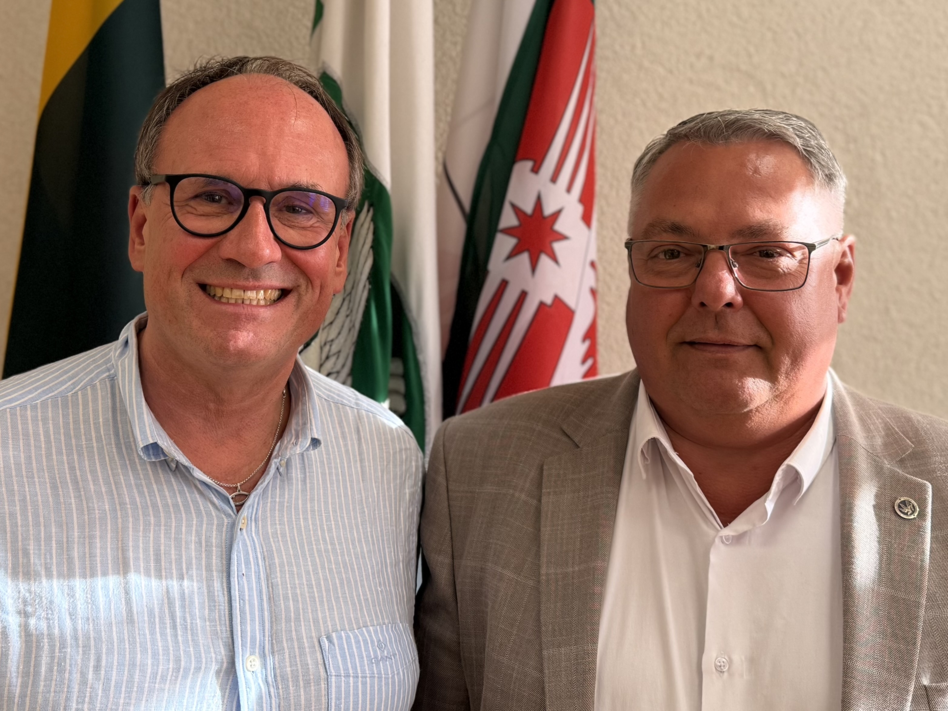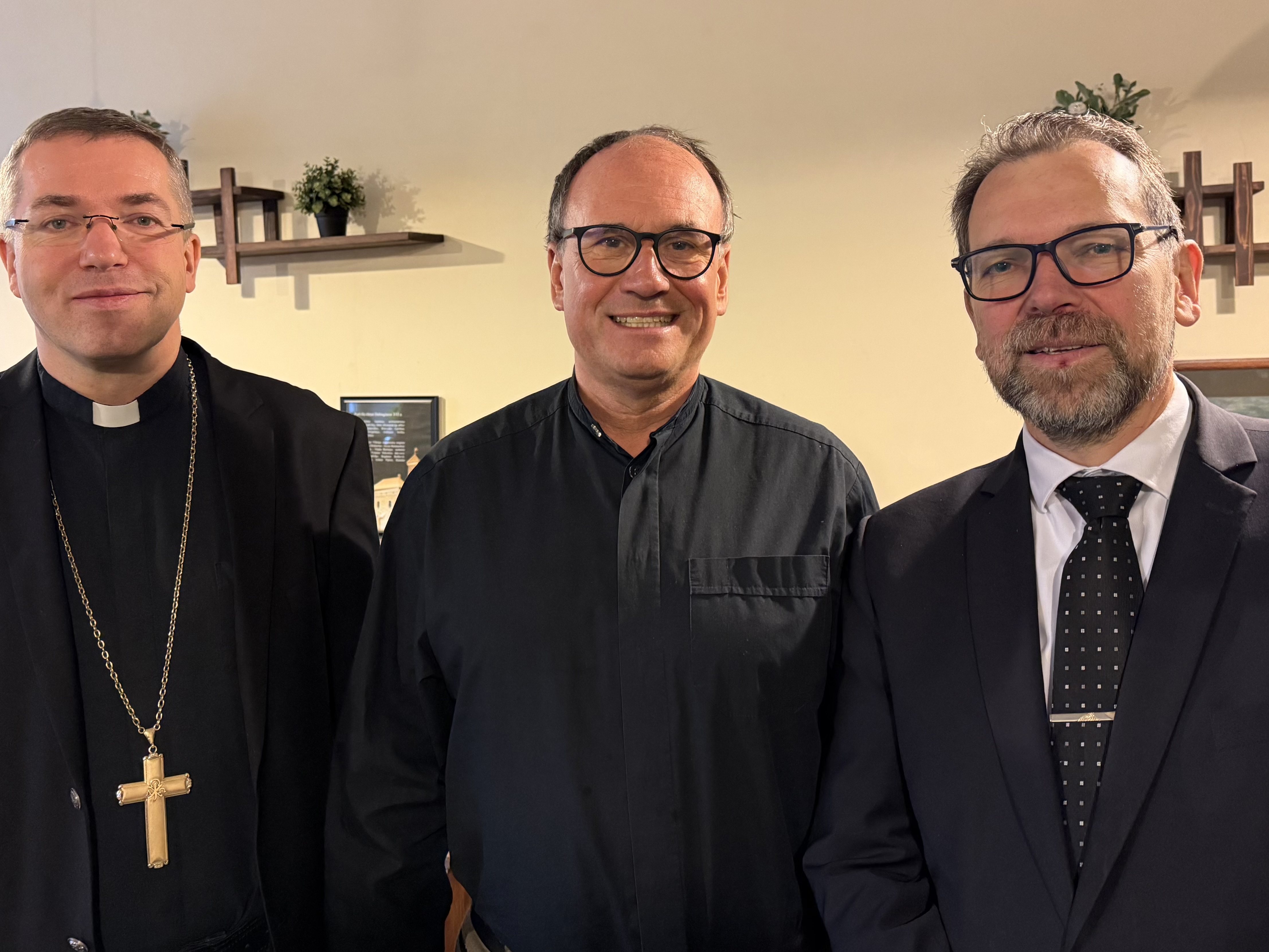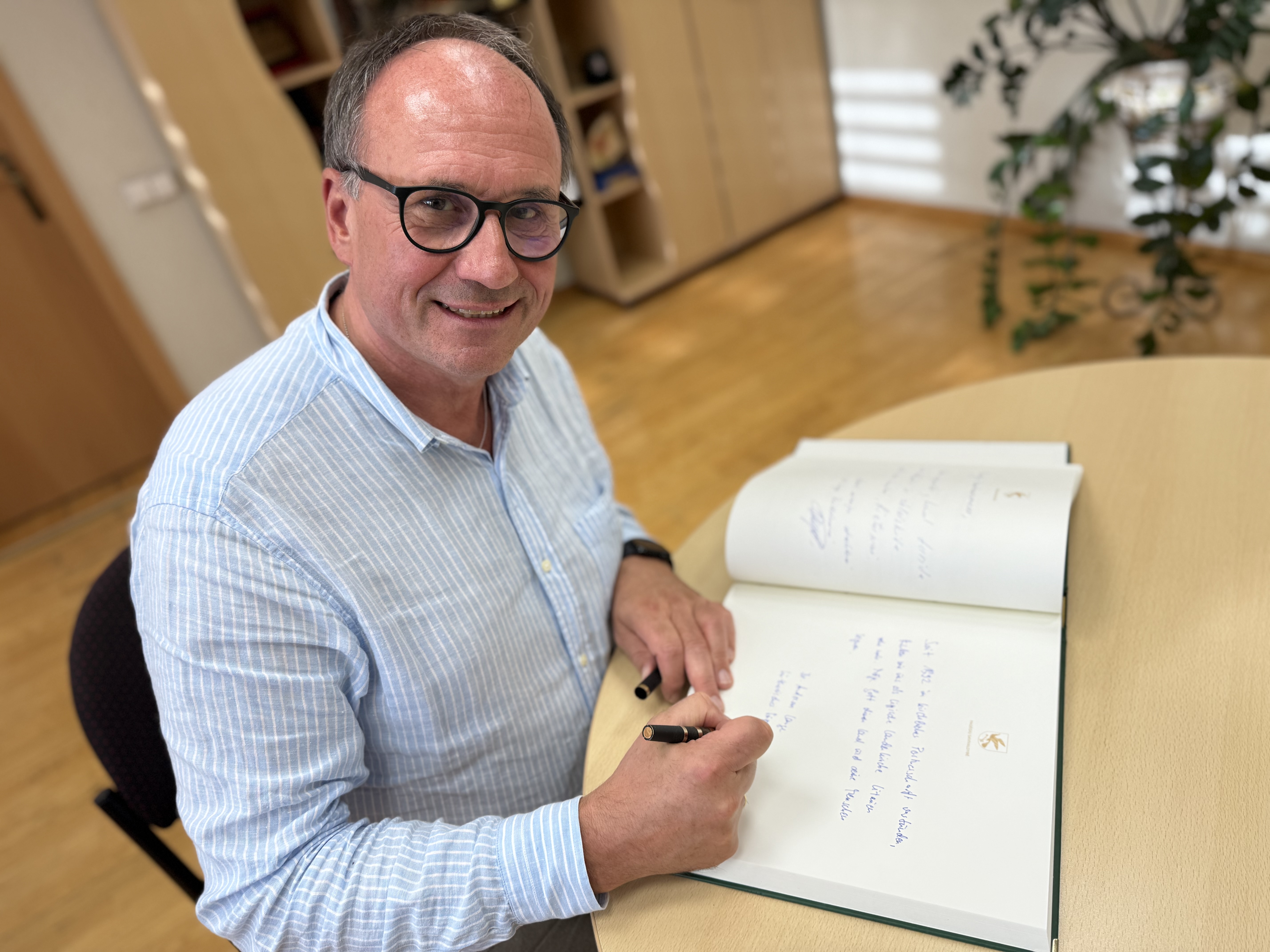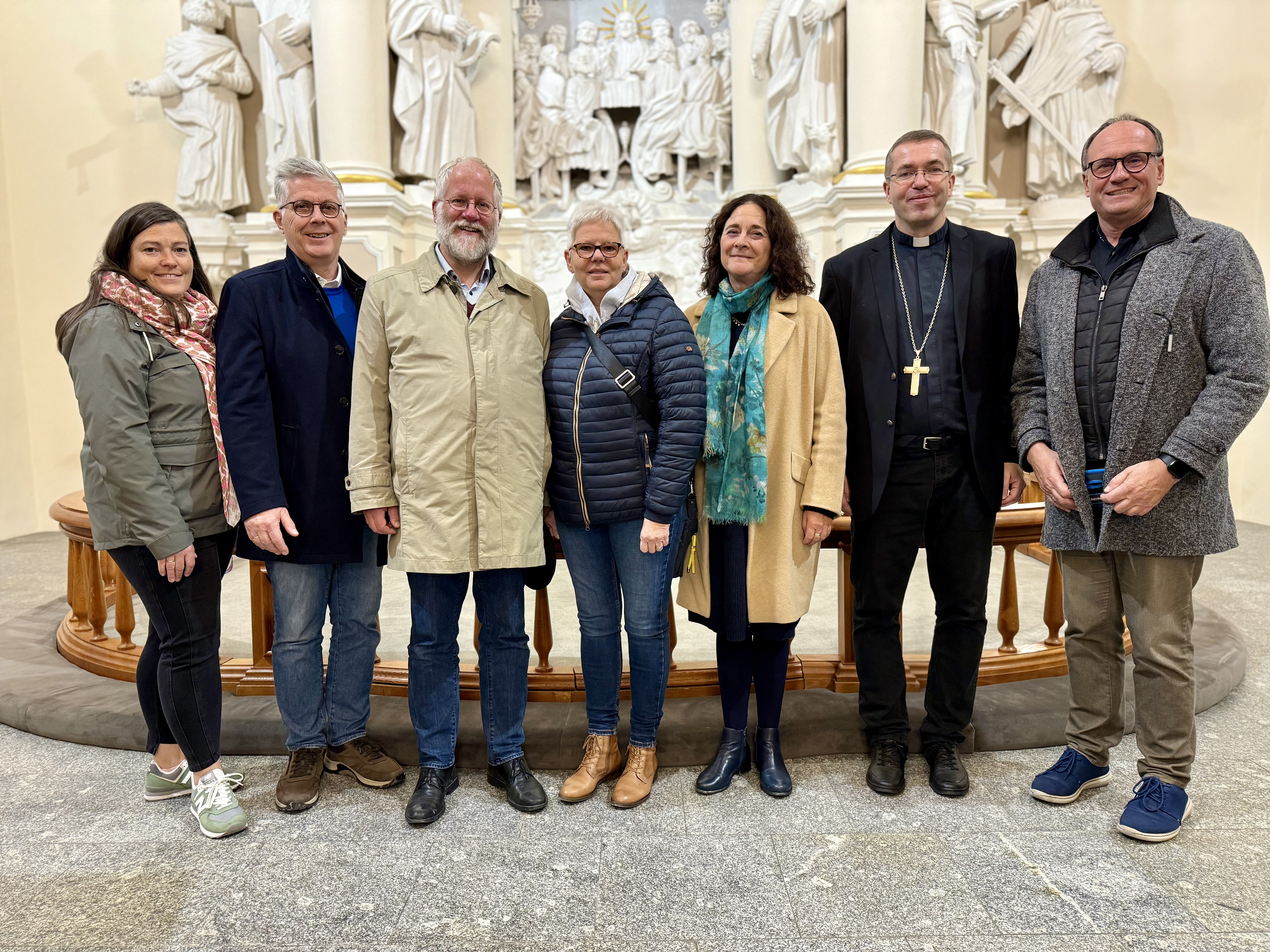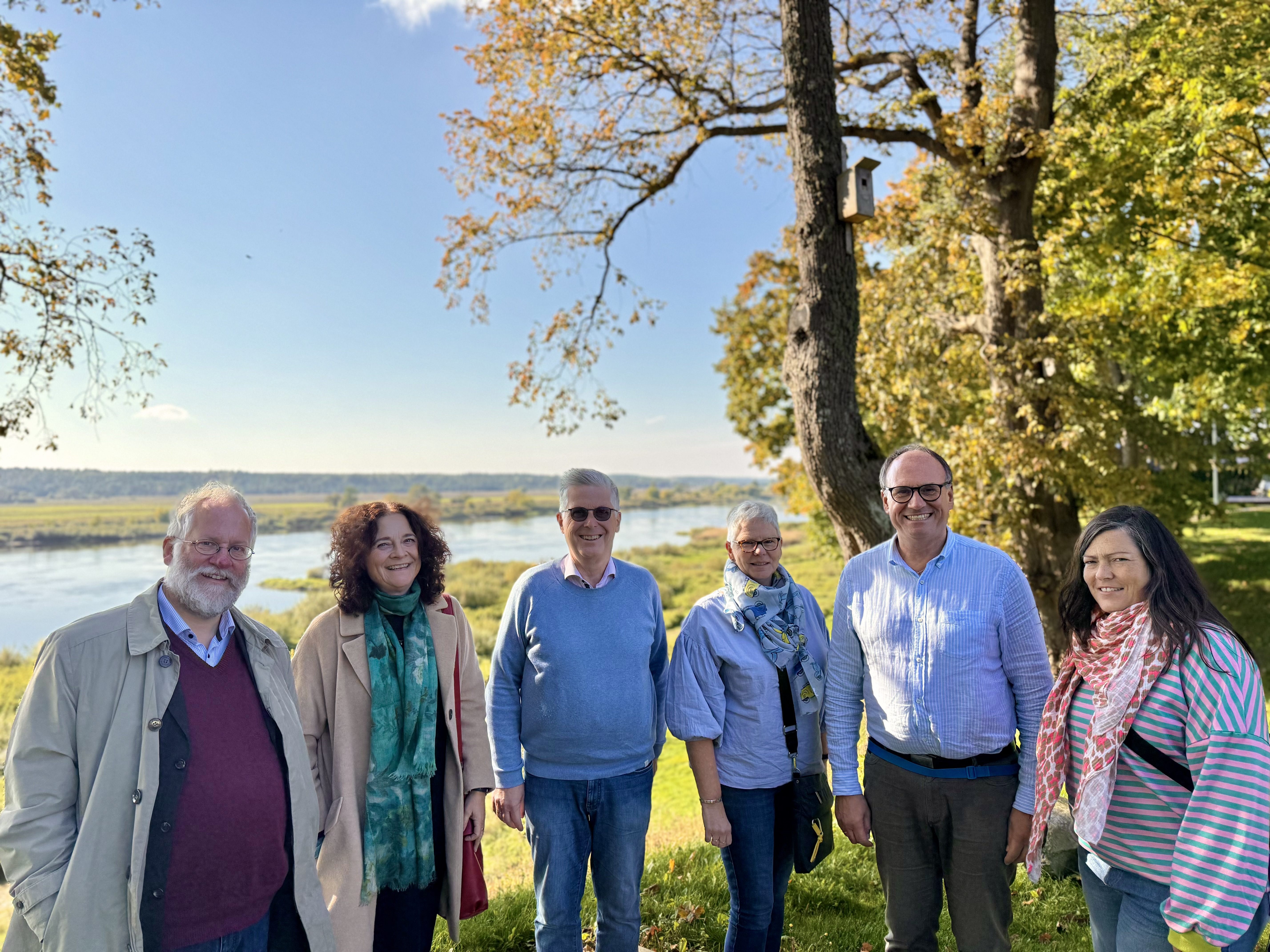 Das Gruppenbild links entstand am 8.10.2025 in Jurbarkas. Von links Pfarrer Mindaugas Kairys, Pfarrein Steffie Langenau, Superintendent Dr. Andreas Lange, Silke Knöner, Pfarrer Frank Erichsmeier, Gerold Werner und Sabrina Landenberger – mit der Partnerschaftsurkunde in Händen.